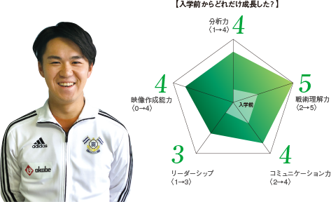 映像編集や試合分析、監督・選手へのフィードバックなどを行うアナリスト。在学中から実際のチームに帯同して現場経験を積み、一般的には求人が出ないJリーグクラブのトップチームへ卒業生を輩出しています。