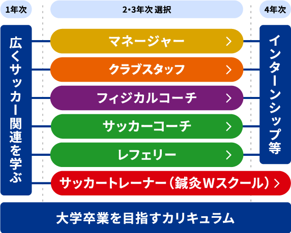 4年間でサッカー業界への就職を目指すだけでなく、心理学や経営・ビジネス教養などを学び、サッカー業界のプロとしての総合力UP!