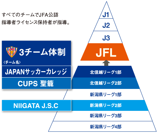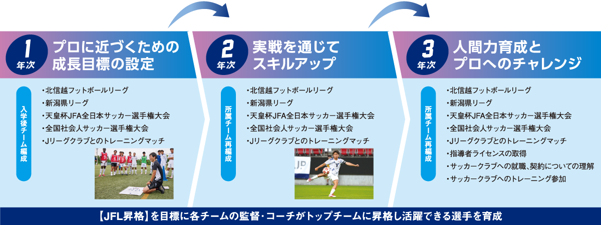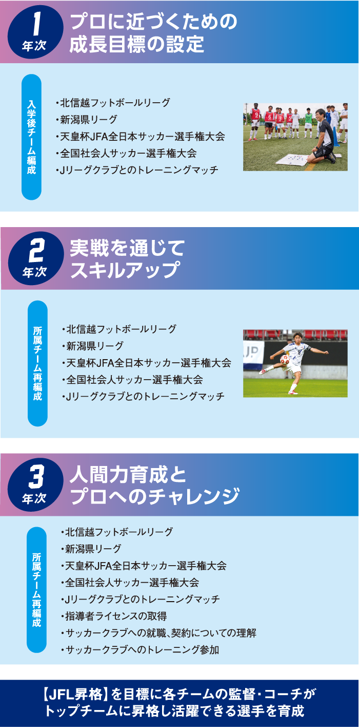 Jリーグへとつながる「日本フットボールリーグ(JFL)」昇格を目指し、一人ひとりのレベルに合わせて指導が行える3チーム編成。トップチームは元プロ選手を有するチームと戦う「北信越フットボールリーグ1部」に参戦しています。リーグ戦以外にも、Jクラブと対戦が可能な「天皇杯JFA全日本サッカー選手権大会」や、社会人サッカーの頂点を目指す「全国社会人サッカー選手権大会」でプレーするチャンスがあり、プロへのアピールの場があります。