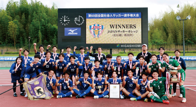 滋賀県で行われた「第60回全国社会人サッカー選手権大会」にJSCトップチームが出場し、新潟県勢初・学校初の優勝をつかみ取りました。1回戦から決勝まで5日間で5試合を戦い、リーグ戦とは異なる状況での厳しい戦いをチーム一丸となって勝ち抜くことができました。多くのスカウトが視察に来ている中で、次につながる結果を残すことができました。