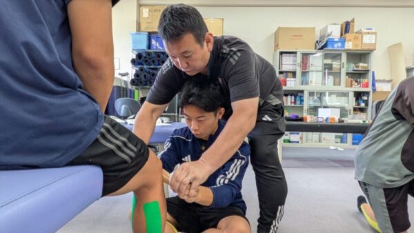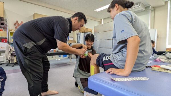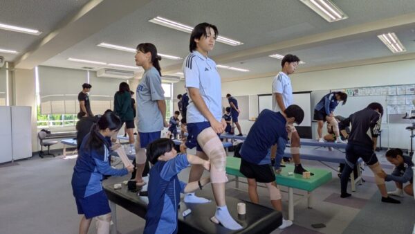 授業で巻くときは、ペアの相手とテーピングがキツくないか、しっかり固定できているかを話しながら行うことを意識して取り組んでいます!