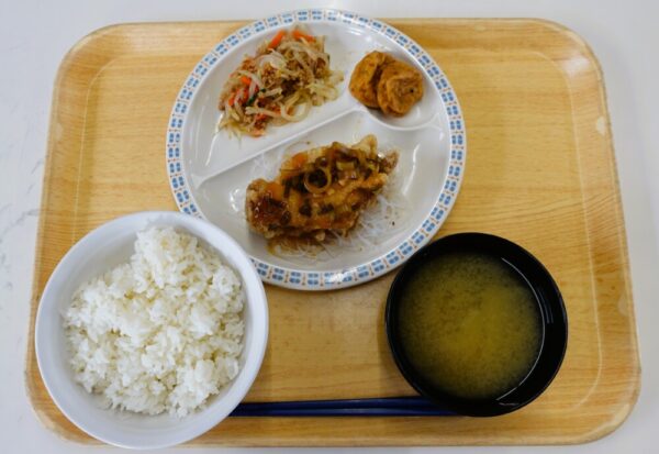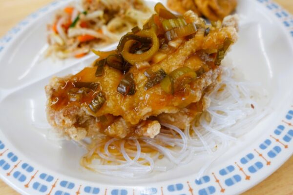 カリっとした食感が楽しい、油淋鶏 2024.12.23 学校情報 今回の献立は ごはん 玉ねぎの味噌汁 油淋鶏 にらもやし炒め がんも煮 これはガッツリご飯が食べられそうなメニュー。 油淋鶏はカリッとした食感と甘酸っぱいソースがたまりません。 長ネギ、生姜、ニンニク、ごま油の香味がいい感じです。 それと、下にしいてある春雨が、ソースと絡んで無駄なくエコで美味しい。 にらもやし炒めもシャキシャキしています。味付けも濃い目で さらにごはんが進みそうです。 がんも煮はとってもジューシー。出汁がしみこんで、 とっても やさしい味わい。 今日もご馳走様でした。