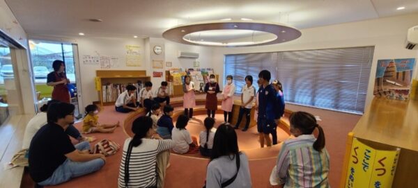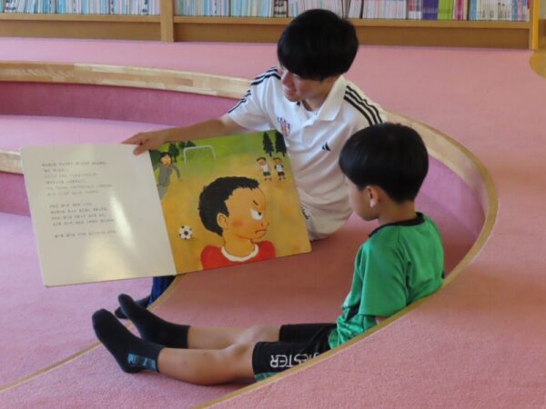私達は「アルノとサッカーボール」、「へんしんマラソン」を、コラボで「これはのみのぴこ」を赤いふうせんの皆様と読み聞かせを行いました!読み聞かせ初挑戦で緊張しましたが、みなさん真剣に聞いてくれて、とても楽しかったです!
