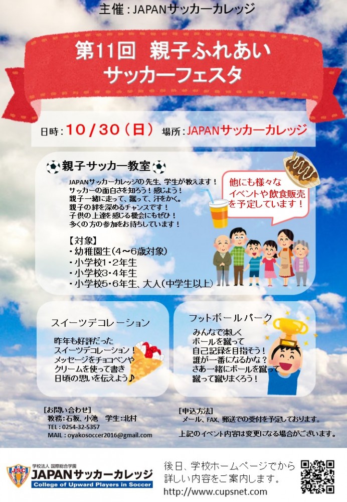 ↓【第11回親子ふれあいサッカーフェスタ2016】 追加のご案内はこちら↓ 【第11回 親子ふれあいサッカーフェスタ 追加のご案内】 今年もやって参りました!「第11回 親子ふれあいサッ … 続きを読む 第11回 親子ふれあいサッカーフェスタのご案内