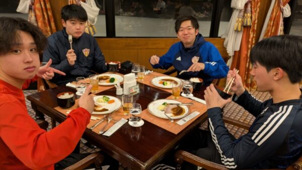 夕方にはスキー場を後にし、ロイヤル胎内パークホテルへ向かいました。温泉やコース料理を堪能し、その後の時間は部屋でボードゲームをしたり、大広間で卓球をしたりと各々友人と楽しい時間を過ごして充実したホテル生活となりました。寝心地最高なお布団で睡眠をし、2日目に備え1日目を終えました。