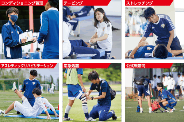 サッカー現場でのトレーナー業務は、選手の健康管理、テーピング、ストレッチング、ケガの応急処置や防止、アスレティックリハビリテーション(競技復帰に向けてのリハビリ)など、様々です。どの年代・カテゴリーでも必要となる知識や技術を、入学後からの3年間で基礎から学びます。理論だけでなく現場での経験を積んだサッカートレーナーとして、インターンシップ・就職試験に臨みます。