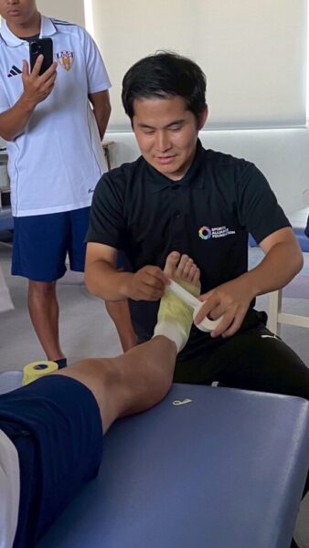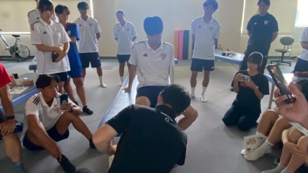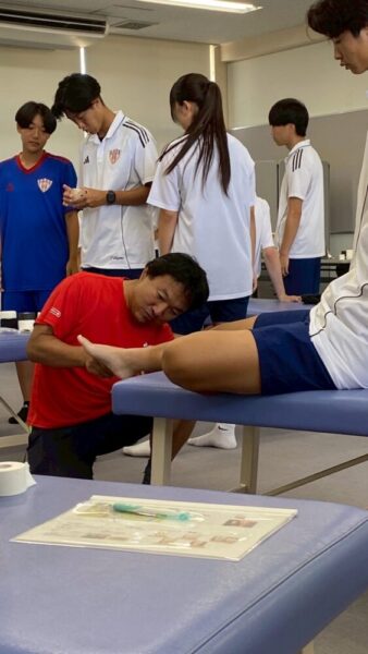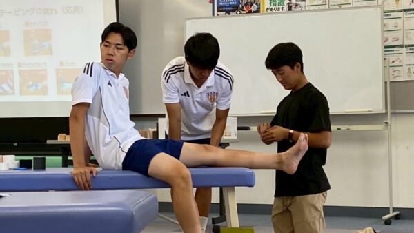 参加された方も再度巻き方を確認することができ、和気あいあいと楽しくテーピングに取り組んでいました。ラグビー部のマネージャーさんも参加いただき、膝を巻く機会が多いけれどいつもは先生が巻いているのでと自信なさそうにしていましたが、しっかり練習が出来ましたので、次回からはマネージャ―大活躍できそうな予感がします。これから合宿本番になるとのこと!八月には菅平合宿。老田もラガーマンでしたのでよくわかります。あのきつい合宿がこれから始まると思うと震えがきますが、その合宿でもマネージャ―さん大活躍してくれるのではないでしょうか?頑張ってくださいね。