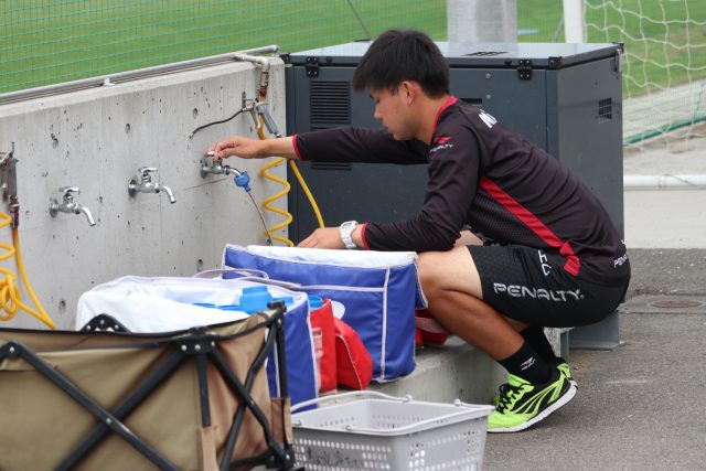 現在の業務内容は練習の準備・サポート、トレーニングウェアの洗濯、管理のほかに、試合のアウェーゲームの備品の準備を担当しています。同期で入ったJSC出身の新関チームマネージャーはホームゲームの備品準備を担当し、互いにサポートしながら日々の業務に当っています。