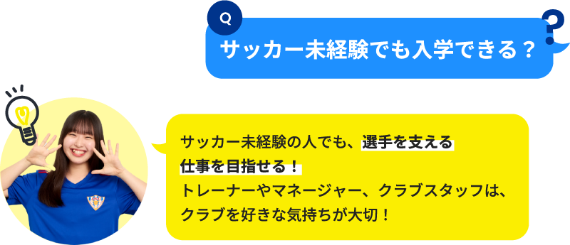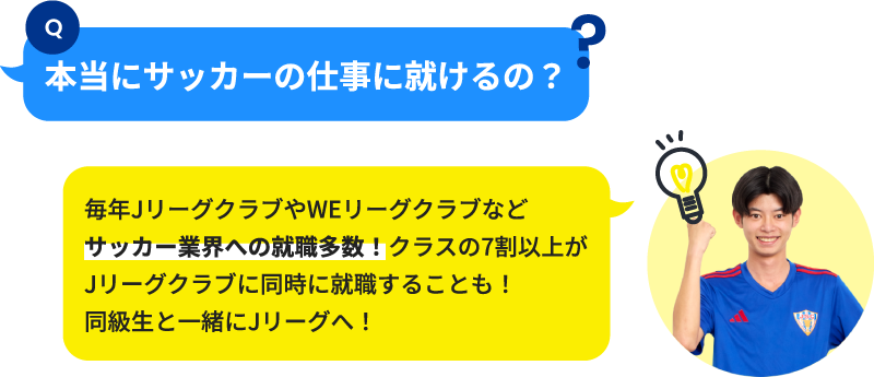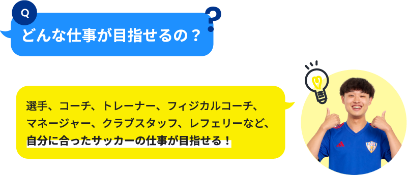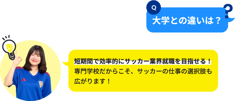 大学では様々な分野・業種にチャレンジすることが出来て、専門学校は進路の幅が狭まる?そんなことはありません。“サッカーと共に生きる”という思いがあれば、サッカーの専門学校だからこそ、サッカーに関わる方法の選択肢を増やせます。なかなか一般には知られていない、サッカー関連の仕事を見つけられます。