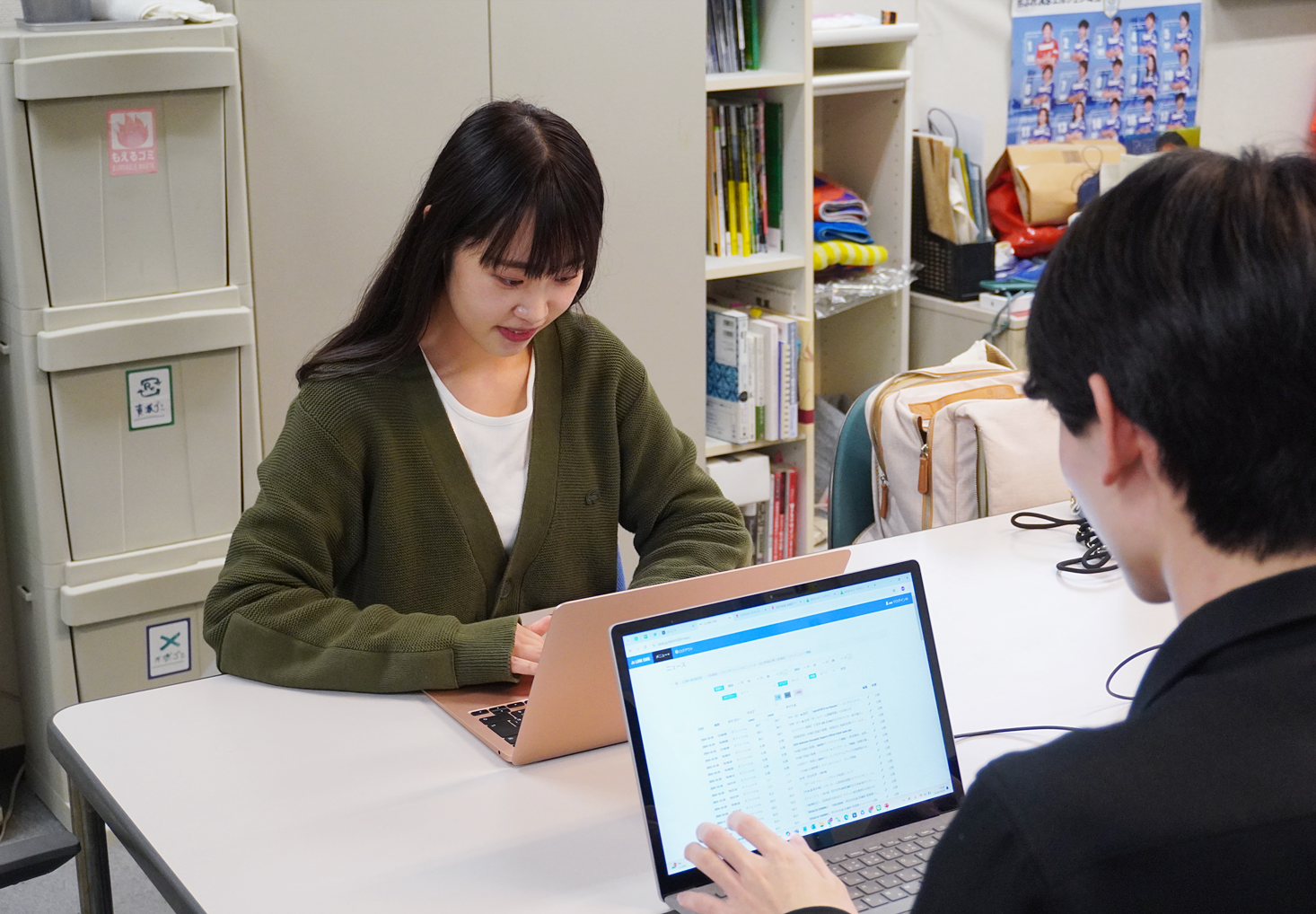 「Jリーグクラブや他スポーツのクラブ、リーグの方から依頼を受け、WEBサイトの制作やSNSの運用などを行っています。クラブごとに目標にしているものや広めたい情報は異なるので、依頼主の意向を細部まで理解し、形にするためにはお客様とのコミュニケーションが不可欠になります。その面においても、在学中の実習でいろいろな人と関わる経験ができたのは良かったと思いますね。他にもYouTubeの動画や画像の制作をすることもあるので、授業の中でPCのツールを使えるようになっていたのが役に立っています」